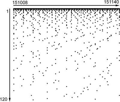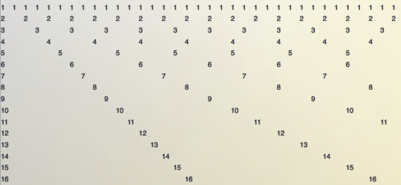 If we zoom the view out even further and change the numerals to dots, we see even more patterns. Here are the divisors ranging from 1 to 120 for a section of the number line in the vicinity of 151,080.