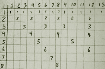 a process where each stage involves hopping along the number line with increasingly larger steps. This activity progressively stamps out the composite numbers, to identify primes. It's kind of like stacking these picket fences, each one with a larger gap between its slats - to eliminate the holes. Some holes will always remain. Those are the primes.